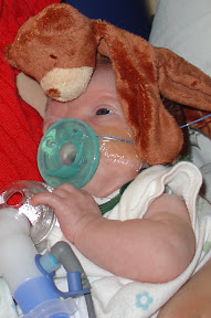 The resident said today's chest x-ray looked better than yesterdays. He thinks the diuretics helped. They've ordered a swallow study for this week to confirm weather or not Chase has reflux. He's tolerating the continuous feeds much better than the every 3 hour feedings. If Chase does have reflux and they're concerned about aspirating, they'll have to put in a G-tube; which I don't know enough about to explain well, but it would be another surgery and would allow him to get fed directly into his stomach. Hopefully that can be avoided, but if not, we'll deal with it. They said he's not gaining weight as fast as they would like, which was a surprise to us. And they can't really increase the amount of food if he doesn't tolerate it. I tell ya, if it's not one thing it's another! Ah, the complexity of medicine and the human body, which at one time I found fascinating....now I find frustrating!! So Chase won't get the bottle feeding trials until after the swallow study...but he's still sucking away on his binkie!