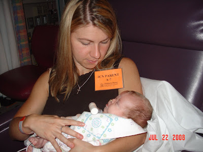 The surgery went well. Everything happened pretty fast. When we arrived this morning, they had his IV in and he was ready to go. We were able to hold him for a little while, and then the surgery nurses came to take him down to the OR. We went down with them, met all the doctors and the surgeon, and kissed him good-bye. A couple hours later, the surgeon came in and told us everything went perfect. They were able to do the fundo laprascopically, so all the incisions are pretty tiny. They also circumcised him. He was only in the recovery room for about an hour before they moved him back up to the NICU. He was off the vent by this point, so we were really relieved about that because it took him so long to come off the vent after his trach surgery. On our way up from the recovery room, he starts making the sucking motion with his mouth. It was pretty cute and nice to see because he was so out of it and motionless after his trach surgery. He was probably wondering where his bottle was since we had been pushing it so much recently. He gets a little agitated occasionally, but once we give him his binkie he relaxes. He's on morphine for the pain, and his blood sugar was a little high after surgery so they're keeping an eye on that. Grammy sat with him for a long time this afternoon and sang to him and held his hand. He really loved it! They'll start feeding him again tomorrow, and once he recovers, we're out of there! Thanks to everyone for the prayers and support!!! I wish I could articulate just how much it means to us and somehow repay our gratitude!!!
