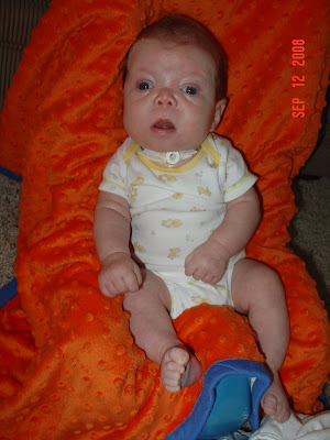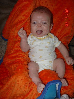 Occupational theray came this week as well. She brought what is called a Feeder Seat that helps Chase sit upright and will help strengthen his neck muscles. He did better with the bottle this week, but there's still more work to do so OT will come weekly now. We're doing more 'tummy time' and different things to work on Chase holding his head up. He's beginning to reach for things and track things better, so he's making progress developmentally I think.